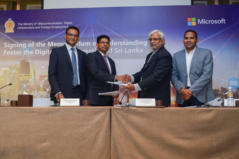 The MoU will enable the ministry to improve the efficiency and create good governance across the government to ensure effective citizen services for the people of Sri Lanka. It was signed on May 16th, 2018 at a special ceremony in Colombo by Wasantha Deshapriya, Secretary to the Ministry, and Hasitha Abeywardena, Country Manager of Microsoft Sri Lanka and Maldives. The signing was held in the presence of Hon. Harin Fernando, Minister of Telecommunication, Digital Infrastructure and Foreign Employment.