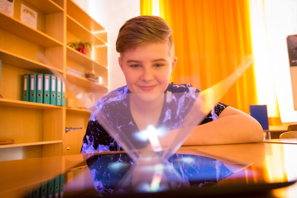In der nächsten Stunde geht es weiter mit Physik. Die notorische Langeweile im Physikunterricht, die man von anderen Schulen kennt, kommt bei Schülerinnen und Schülern in Zwettl nicht auf. Das Thema Optik und Hologramme steht am Lehrplan. Via Handys, Tablets und Laptops werden mithilfe von Youtube Videos und selbstgebastelten Pyramiden Reflexionen dargestellt, die einen 3D-Modus vortäuschen. Die Kinder sind fasziniert. Durch den Einsatz von Technologien ist Physik zu einem spannenden Unterrichtsfach geworden. „Einfach nur durch Skizzen und langweilige Bilder hätte ich das Thema nie so schnell verstanden“, ist Manuel überzeugt.