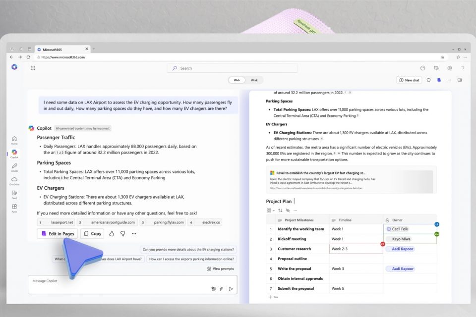 Pages takes ephemeral AI-generated content and makes it durable, so you can edit it, add to it, and share it with others. You and your team can work collaboratively in a page with Copilot, seeing everyone’s work in real time and iterating with Copilot like a partner, adding more content from your data, files, and the web to your Page. This is an entirely new work pattern – multiplayer, human-to-AI-to-human collaboration. For Microsoft 365 Copilot customers, Pages starts rolling out today and will be generally available later in September 2024.