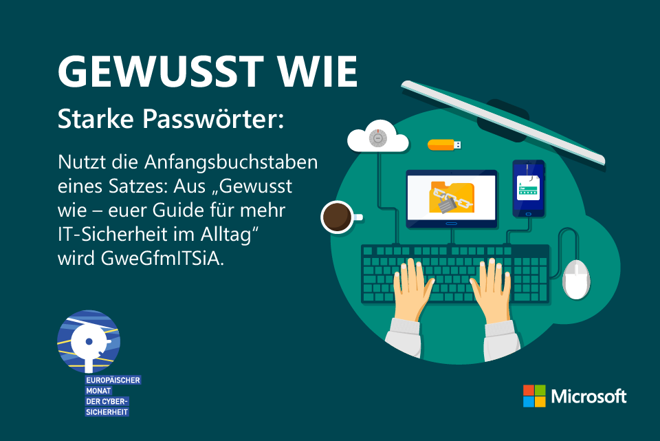 - Statt einer beliebigen Zeichenfolge einfach die Anfangsbuchstaben eines einfach zu merkenden Satzes verwenden. So wird aus „Lieber den Spatz in der Hand als die Taube auf dem Dach“ LdSidHadTadD.