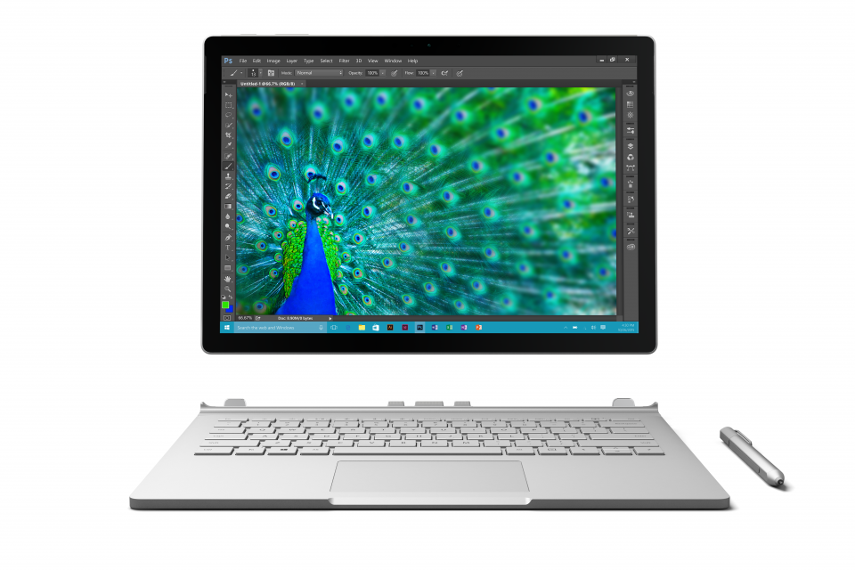 Mit dem Surface Book setzt Microsoft neue Maßstäbe in der Laptop-Welt und richtet sich an Anwender wie z.B. Ingenieure oder Architekten, die sich kreative Flexibilität wünschen, ohne Abstriche bei der Performance machen zu müssen. Im hochwertig designten Magnesium-Gehäuse des Surface Book rechnen leistungsstarke Intel Core i5 bzw. Core i7 Prozessoren der sechsten Generation und ein optionaler Nvidia GeForce Grafik-Prozessor. Dies gewährleistet selbst bei hardware-hungrigen Anwendungen für 3D-Grafik oder Videoschnitt eine flüssige Bedienung. Für das präzise Beurteilen, Bearbeiten und Präsentieren feiner grafischer Details ist das 13,5 Zoll große Touch-Display des Surface Book prädestiniert. Es ist wahlweise drehbar oder kann ganz abgenommen werden. Mit 267 dpi aufgelöst, bildet es besonders scharf, kontrastreich und farbbrillant ab. Dank PixelSense Technologie erkennt es selbst feinste Druckunterschiede bei der Bedienung mit einem Stift und eignet sich daher – im Stile eines digitalen Klemmbretts – hervorragend zum Zeichnen und Festhalten von Notizen. Angesichts einer Akku-Laufzeit von bis zu zwölf Stunden bietet das Surface Book auch genügend Ausdauer für langanhaltende Kreativitäts-Flows.