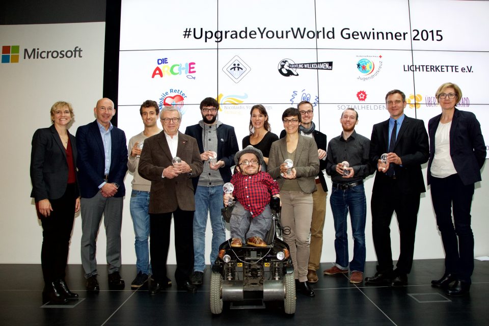 Berlin, 5. November – Microsoft hat heute die zehn deutschen Gewinner der weltweiten Kampagne #upgradeyourworld ausgezeichnet. Im Zentrum stehen Menschen, Projekte und Organisationen, die die Welt zum Besseren verändern. Die ausgewählten Non-Profit-Organisationen werden mit jeweils 50.000 US-Dollar gefördert. Insgesamt erhalten Hilfsorganisationen auf der ganzen Welt zehn Millionen US-Dollar. Fünf der deutschen Preisträger wurden bereits im Vorfeld von Microsoft ausgewählt. Fünf weitere NPOs hat die Internet-Community in einem Online-Voting bestimmt. Die Kampagne steht beispielhaft für das soziale Engagement von Microsoft. Das Unternehmen unterstützt das Ehrenamt nachhaltig – sowohl finanziell als auch mit Technologiespenden.