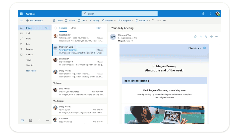 The Viva briefing email provides employees provides employees helpful and actionable Viva content and productivity suggestions sent directly to their inbox.