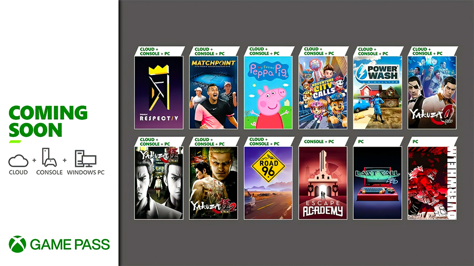 Hoy desvelamos los nuevos juegos que llegarán próximamente al catálogo de Xbox Game Pass para consola, PC Game Pass y Xbox Cloud Gaming, incluidos Last Call BBS, Matchpoint: Tennis Championships, Escape Academy y PowerWash Simulator, que estarán disponibles desde el día 1 de su lanzamiento.
