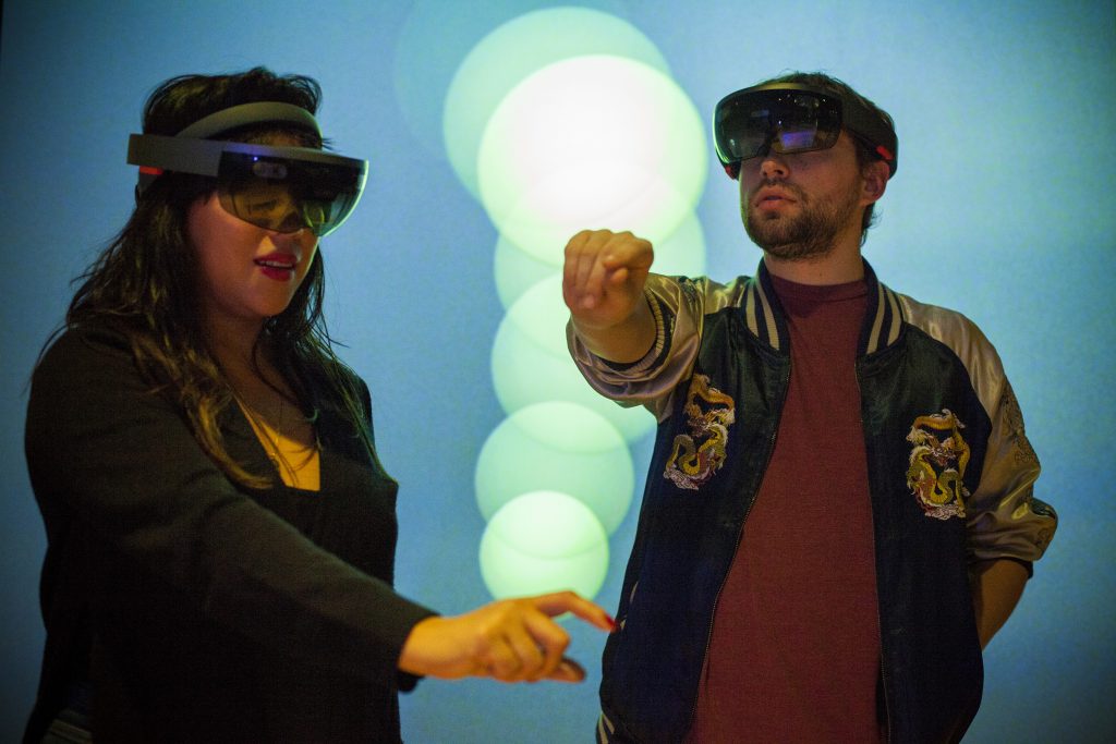 Foto principal: Visitantes de “Bloom: Open Space” usan diademas HoloLens y “pinchan” burbujas 3D para darles vida y crear un colorido jardín sonoro de burbujas y tonos. (Foto por Drew Reynolds)