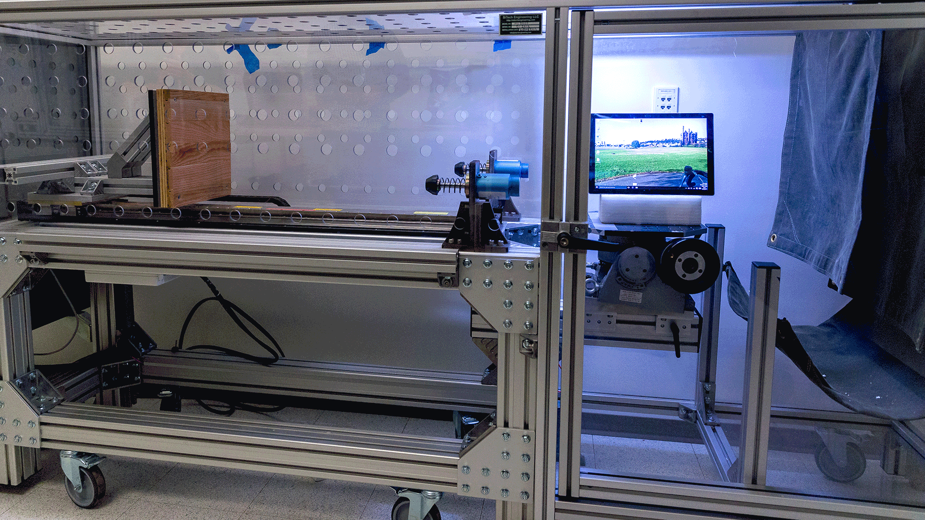 Dos técnicos con protecciones para ojos y oídos se sentaron a cerca de 10 pies de distancia de la torre, mientras miraban sus laptops. Unas cámaras de alta velocidad se enfocaron en el dispositivo empaquetado para capturar cada ondulación provocada por el impacto. Un técnico anunció, “Adquiriendo datos… armando… soltando”. La torre impulsó hacia abajo al dispositivo con un agudo estallido, para simular una caída de 48 pulgadas hacia una superficie de madera.