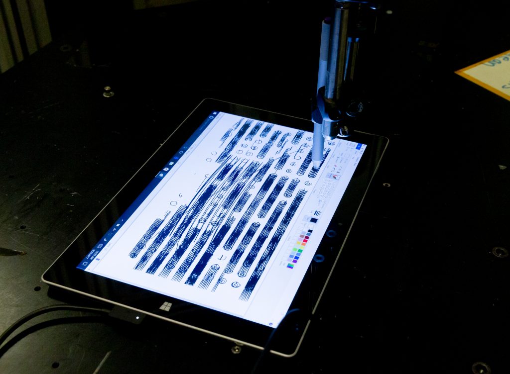 En una habitación, un brazo robótico empuñó una Surface Pen, mientras la guiaba a través de la pantalla de una Surface Studio y producía una cerrada cuadrícula de líneas verticales y horizontales. Luego, el robot limpió la pantalla y empezó de nuevo.