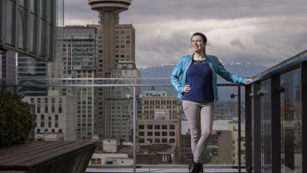 Foto superior: Katie Peters de pie en una terraza en la sede de TELUS en Vancouver, B.C. (Foto de Justin Watts cortesía de Justin Watts; todas las demás fotos de Jennifer Gauthier)