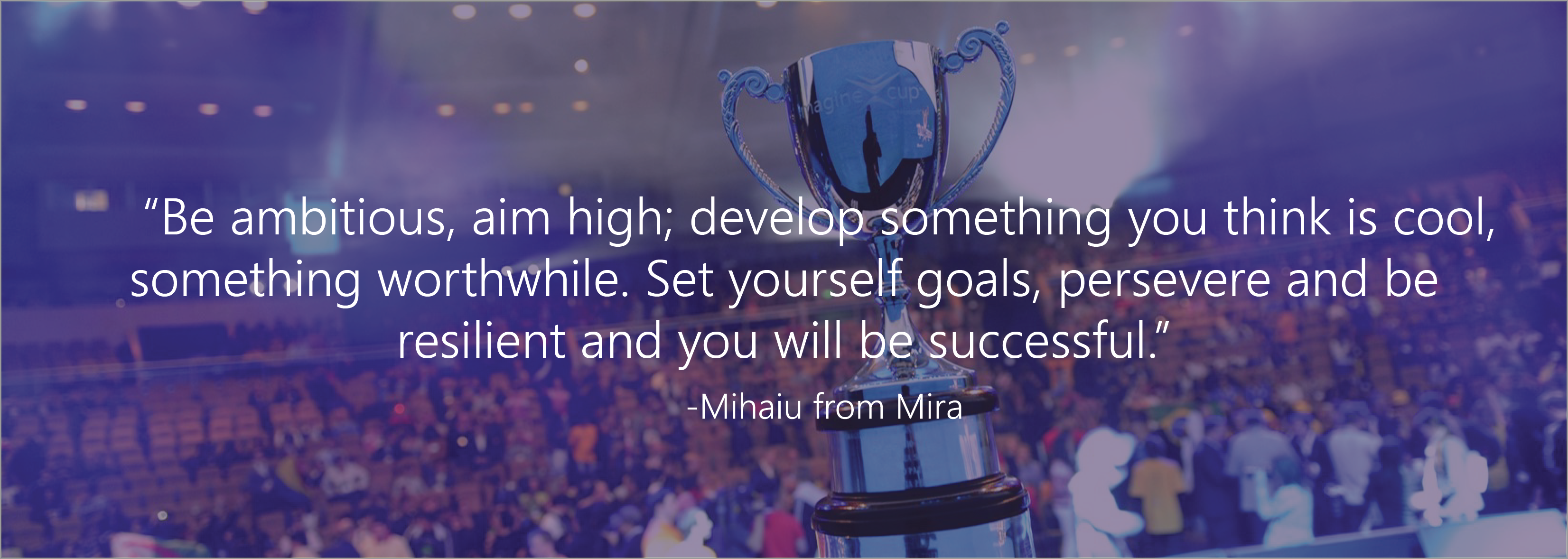 Mihaiu from Mira argues, “don’t let rejection, whether that be from a judge of the Imagine Cup jury, or someone else, change your mind if you believe you have a good product. Be ambitious, aim high; develop something you think is cool, something worthwhile. Set yourself goals, persevere and be resilient and you will be successful.”