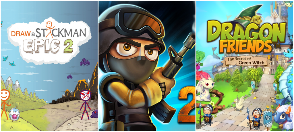 Lead image from left to right: “Draw a Stickman: EPIC 2” by Hitcents, “Tiny Troopers 2: Special Ops” by Game Troopers and “Dragon Friends” by InnoSpark.