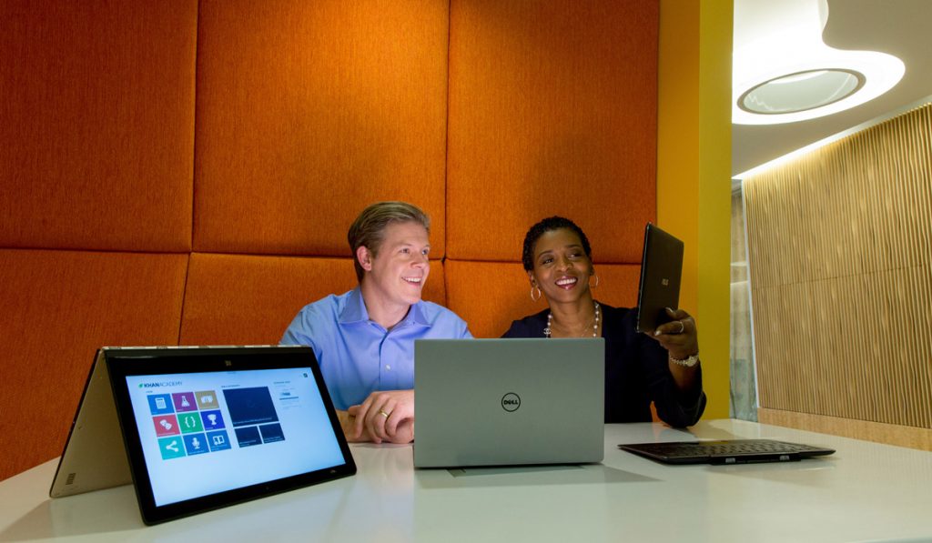 Lead photo caption: Nick Parker, corporate vice president of Microsoft’s OEM Division, and Felicia Guity, general manager in Microsoft’s OEM Division, with some of the new premium Windows PCs that are ideal for both business and higher education environments. These include, from left, the Lenovo Yoga 3 Pro, the Dell XPS 13 and the ASUS Transformer Book T300 Chi. (Photo credit: Scott Eklund, Red Box Pictures)