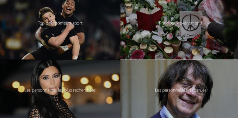 Alors que l’année 2015 s’achève prochainement, Microsoft publie une rétrospective en images des douze derniers mois, fondée sur le top des recherches des Français sur le moteur de recherche Bing. Marquée par une actualité souvent bouleversante, 2015 aura également été l’année de l’e-solidarité, avec une mobilisation nationale et internationale sans précédent, symbole d’humanisme et d’entraide. Pour revivre l’année en images, rendez-vous ici.
