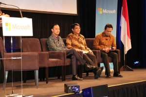 (ki-ka) Thomas Lembong, Menteri Perdagangan Republik Indonesia, Franky Sibarani, Kepala Badan Koordinasi Penanaman Modal dan Triawan Munaf, Kepala Badan Ekonomi Kreatif berada di atas panggung pada saat acara bersama Diaspora Indonesia.