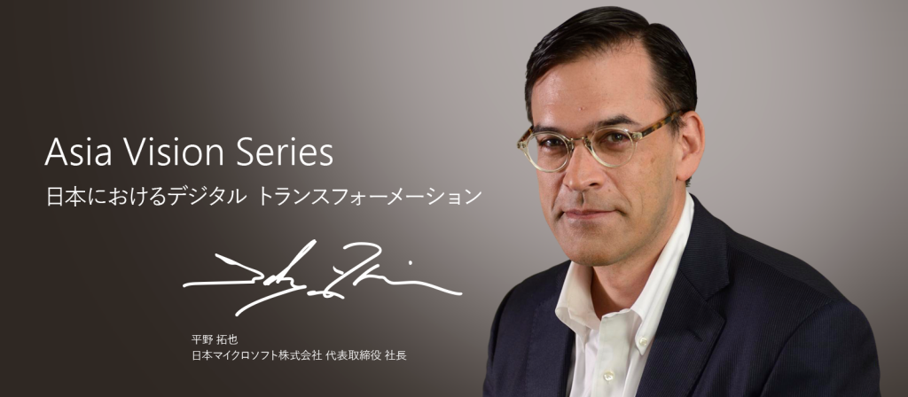 Asia Vision Series (アジア ビジョンシリーズ) *では、重要な業界動向と課題について、アジア各地域の専門家と共に議論していきます。全 3 回の本インタビュー記事では、 元シンガポール The Straits Times 紙の記者で、テクノロジ系ブログの創設者でもあるベテランジャーナリスト アルフレッド スー(Alfred Siew)が、日本マイクロソフト株式会社 代表取締役 社長の平野拓也と対談し、日本企業のデジタルトランスフォーメーションにおける課題について議論しました。また、平野は、個人的なエピソードとして、自分自身のアイデンティティ、他地域でのマネジメント経験が、自身の世界観に与えた影響について語りました。