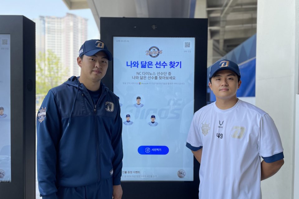 ‘나와 닮은꼴 선수 찾기’는 키오스크에 달린 카메라로 자신의 모습을 사진 촬영하면 AI 기술이 분석해 나와 가장 닮은 NC 선수가 누구인지 알려주는 서비스다. 서비스를 이용하면 닮은꼴 선수와 함께 찍은 것처럼 합성한 사진을 자신의 핸드폰으로 전송할 수 있다. 닮은꼴 선수와 60% 이상 닮은 것으로 나타날 경우 해당 선수의 사인볼을 선물로 받는 이벤트도 진행한다.