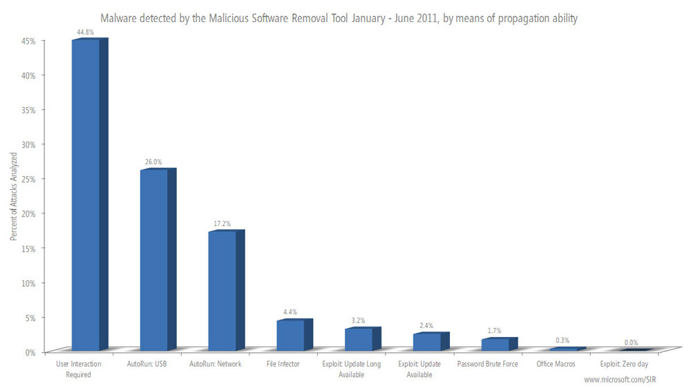 Malware detected by the Malicious Software Removal Tool January – June 2011, by means of propagation ability.