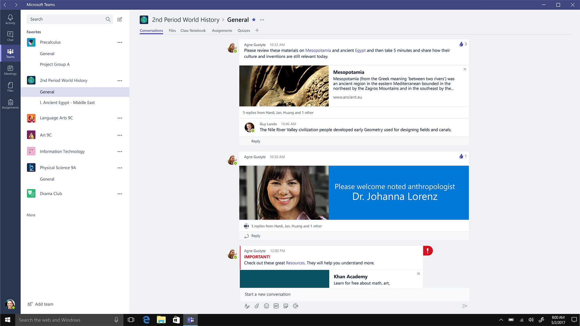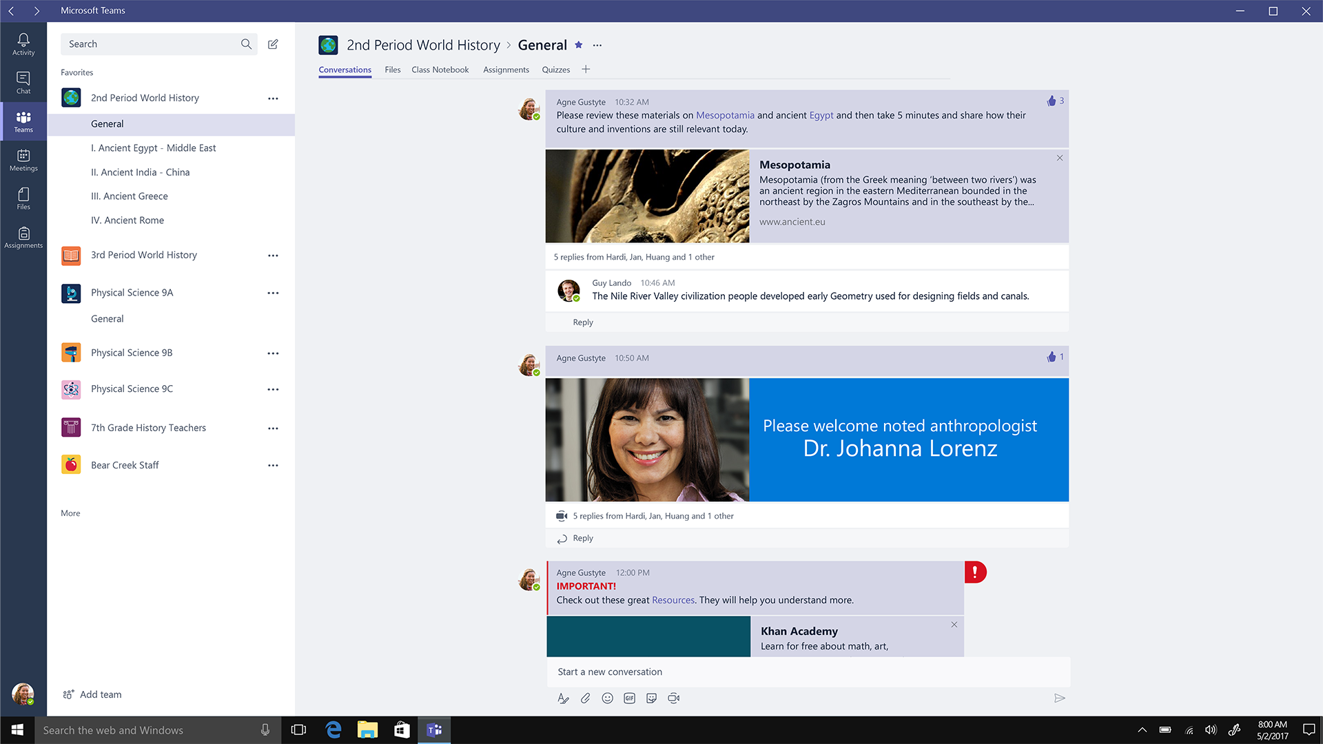 Microsoft introduced a set of educational products and services, inspired by teachers and students, including a new Windows experience called Windows 10 S; new experiences in Microsoft Teams for modern classroom collaboration; new features in Minecraft and mixed reality to spark creativity; a range of Windows 10 S PCs for K-12 classrooms; and the perfect Windows 10 S device for college students—Surface Laptop.