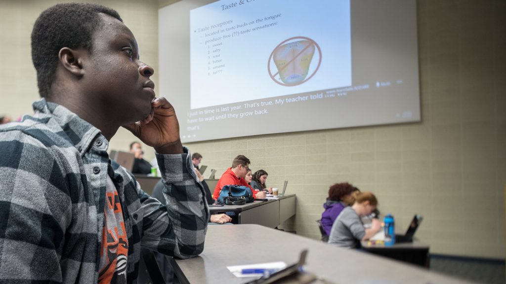 Teraz, podczas drugiego semestru biologii ogólnej, Adjei, który jednocześnie kontynuuje naukę ASL, zajmuje miejsce z przodu sali i regularnie przesuwa swój wzrok między tłumaczem, napisami na ekranie i zapisami na jego telefonie komórkowym, które leży obok na ławce. Połączenie powoduje, że może on być zaangażowany w wykład w sposób ciągły. Kiedy nie rozumie ASL, odwołuje się do napisów, które dostarczają innego źródła informacji i treści pominiętych przez tłumacza.
