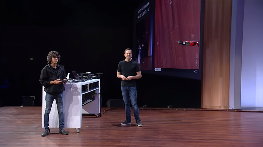 No alto: Demonstração de drone da DJI durante a conferência Microsoft Build 2018. Para ver a demo completa, clique aqui.