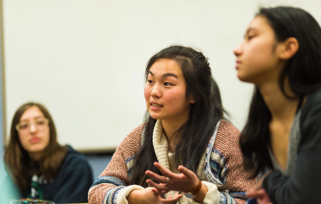 No alto: a estudante Jill Kumasaka fala sobre questões de Ciências Exatas durante uma sessão da Franklin High School com outras estudantes, onde a CFO da Microsoft, Amy Hood, falou no Dia Internacional da Mulher. (Foto: Dan DeLong)
