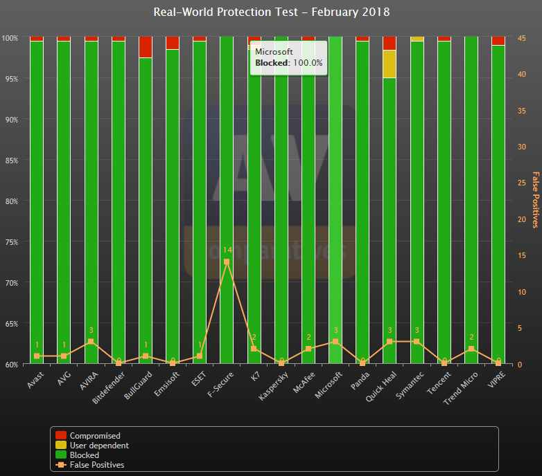 Para AV-Comparatives, alcançamos recentemente outro importante marco de qualidade: por cinco meses consecutivos, detectamos todas as amostras de malware. Nosso melhor resultado anterior foi de quatro meses consecutivos. O gráfico AV-Comparatives abaixo apresenta os nossos resultados de fevereiro de 2018, nos quais obtivemos uma taxa de bloqueio perfeita de 100%.