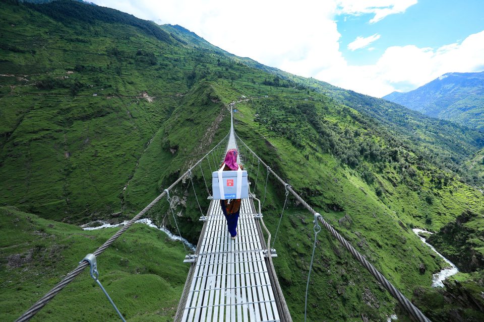 Foto de capa: Um profissional de saúde no Nepal leva vacinas de COVID-19 para uma clínica em uma parte remota do país. (Foto de Laxmi Prasad Ngakhusi, cortesia da UNICEF)