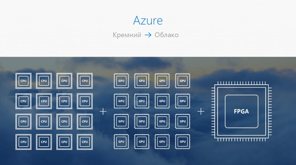 Для эффективной работы сервисов на основе технологии искусственного интеллекта требуются компоненты более высокого уровня. Мы «разместили» в облаке Azure множество программируемых вентильных матриц (Field-Programmable Gate Arrays, FPGA), которые могут напрямую взаимодействовать с сетями. FPGA представляют собой программируемые аппаратные средства, которые не только повышают скорость и продуктивность работы, но также предоставляют нужную гибкость.