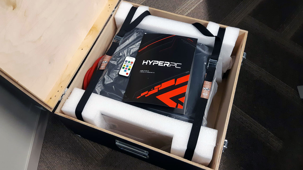Системный блок HYPERPC LUMEN приехал в добротном фанерном ящике, который сразу дает почувствовать, что ты открываешь не коробку с безделицей, а стратегический боеприпас.