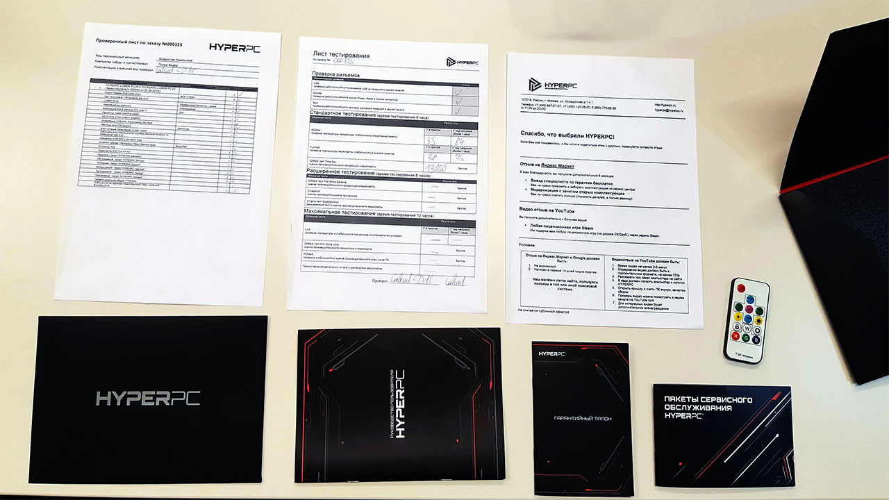 Сверху лежат пульт для управления подсветкой и папка (руководство пользователя, гарантийный талон, лист тестирования, проверочный лист). В документах указана фамилия человека, который проверял устройство, так что при возникновении вопросов, понятно, с кого спрашивать. Уже до начала использования появляется уверенность, что производитель уважает своего клиента и серьёзно относится к сервису. Так на гарантийное обслуживание специалист выезжает к вам бесплатно, а не вы тащите на себе ПК в центр обслуживания.