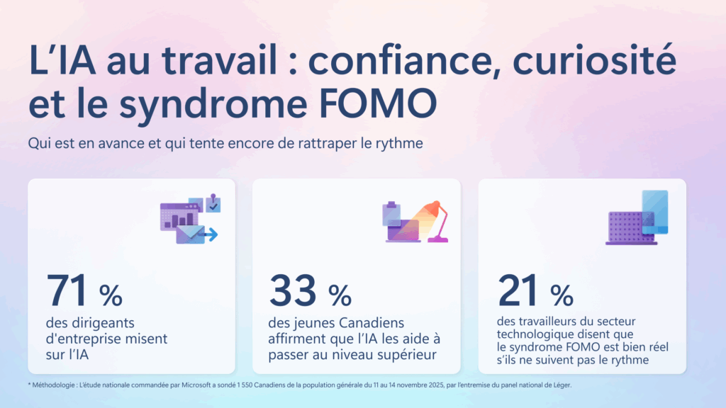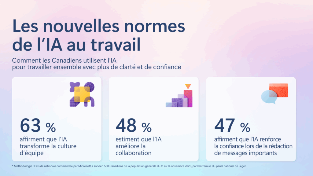 Méthodologie : L’étude nationale commandée par Microsoft a sondé 1 550 Canadiens de la population générale du 11 au 14 novembre 2025, par l’entremise du panel national de Léger.
