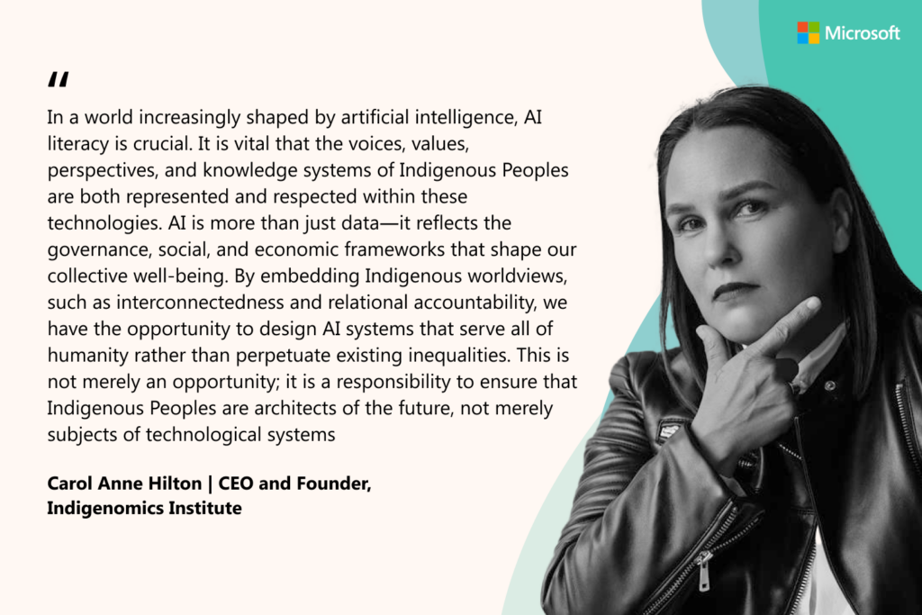 - Indigenomics Institute – Microsoft has joined Indigenomics Institute as a contributing collaborator to IndigenomicsAI, an Indigenous economic intelligence platform. This initiative outlines the Indigenous economic value beyond the $100 billion of Indigenous economic target while showcasing the growth and potential of the Indigenous AI economy. Indigenomics Institute seeks to develop technology-driven frameworks to assist Indigenous businesses in accessing financial resources, scaling effectively, and achieving economic self-determination. Microsoft is dedicated to maintaining and strengthening relationships with Indigenous communities to promote educational opportunities and enhance AI literacy and awareness within the AI economy.