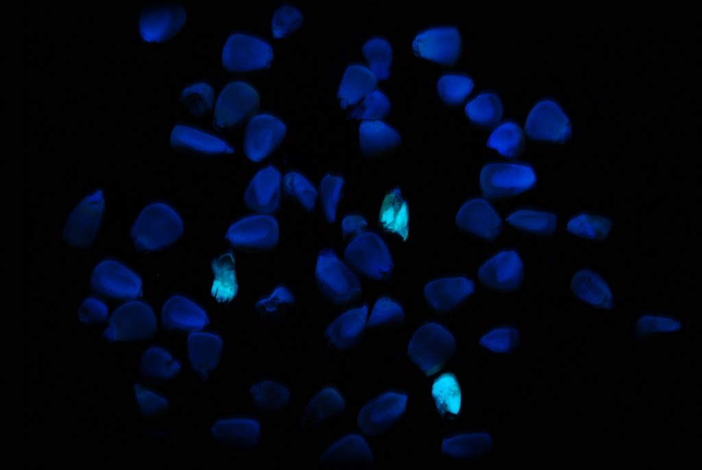 Top image: Kernels of corn infected with aflatoxin glow under UV lights. (Photos courtesy of Bühler)