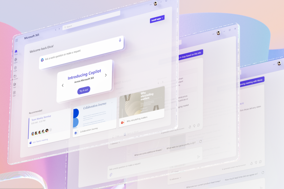 - 首先,智能 Copilot副驾驶®将会被内置到用户每天都会使用的Microsoft 365应用中去,其中包括Word、Excel、PowerPoint、Outlook、Teams等。