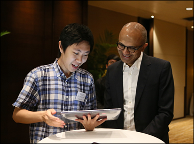 微软首席执行官萨提亚 • 纳德拉在中国的第一个早晨和一群年轻人一起度过。八名在微软“创新杯”和“青年星火计划”中表现优异的大学生向这位曾经“学霸”展示了他们的作品。