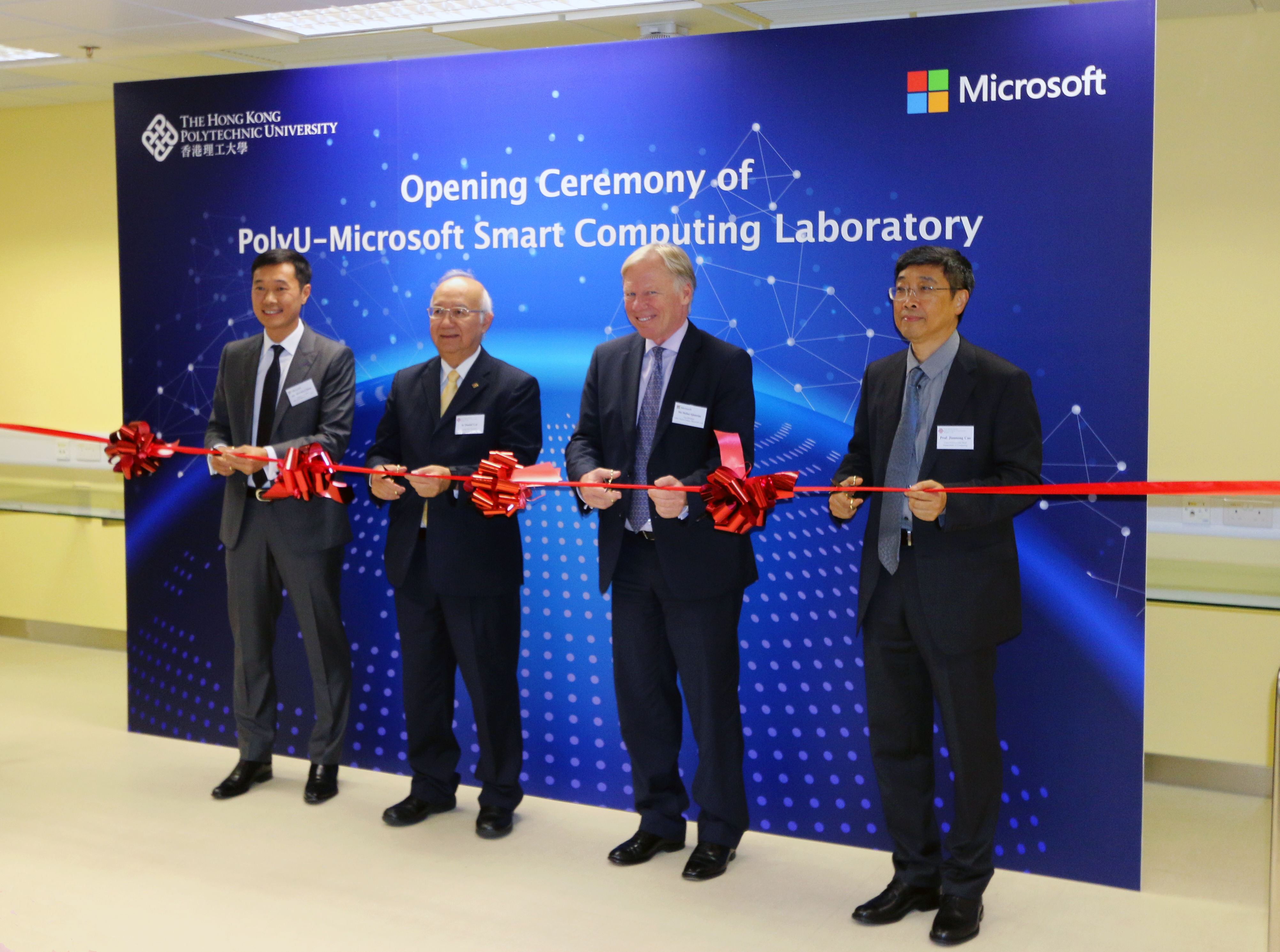 2015年9月10日,香港 — Microsoft與香港理工大學(理大)於去年十二月宣布與理大電子計算學系攜手成立的PolyU-Microsoft Smart Computing Laboratory今日正式開幕;透過聯合實驗室支援智能運算技術應用研究及其教學活動,促進開發工作上的應用和培訓。開幕典禮由理大暫任副校長(行政)賴錫璋工程師、Microsoft 亞太區公共事業部副主席Stefan Sjoestroem、Microsoft Hong Kong 總經理鄒作基先生及理大電子計算學系講座教授及系主任曹建農教授主持。