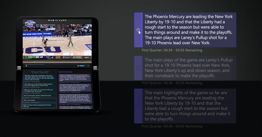 例如,體育聯盟為了增加球迷在比賽期間的互動,正開發一款應用程式,他們利用模型快速總結資訊的能力,將直播節目的評論文字轉換為比賽精華擷取,並在應用程式中呈現。