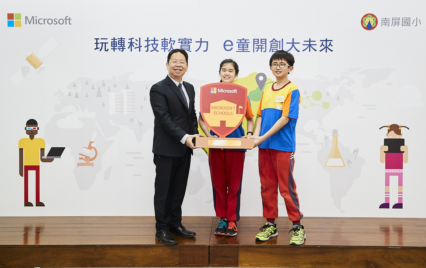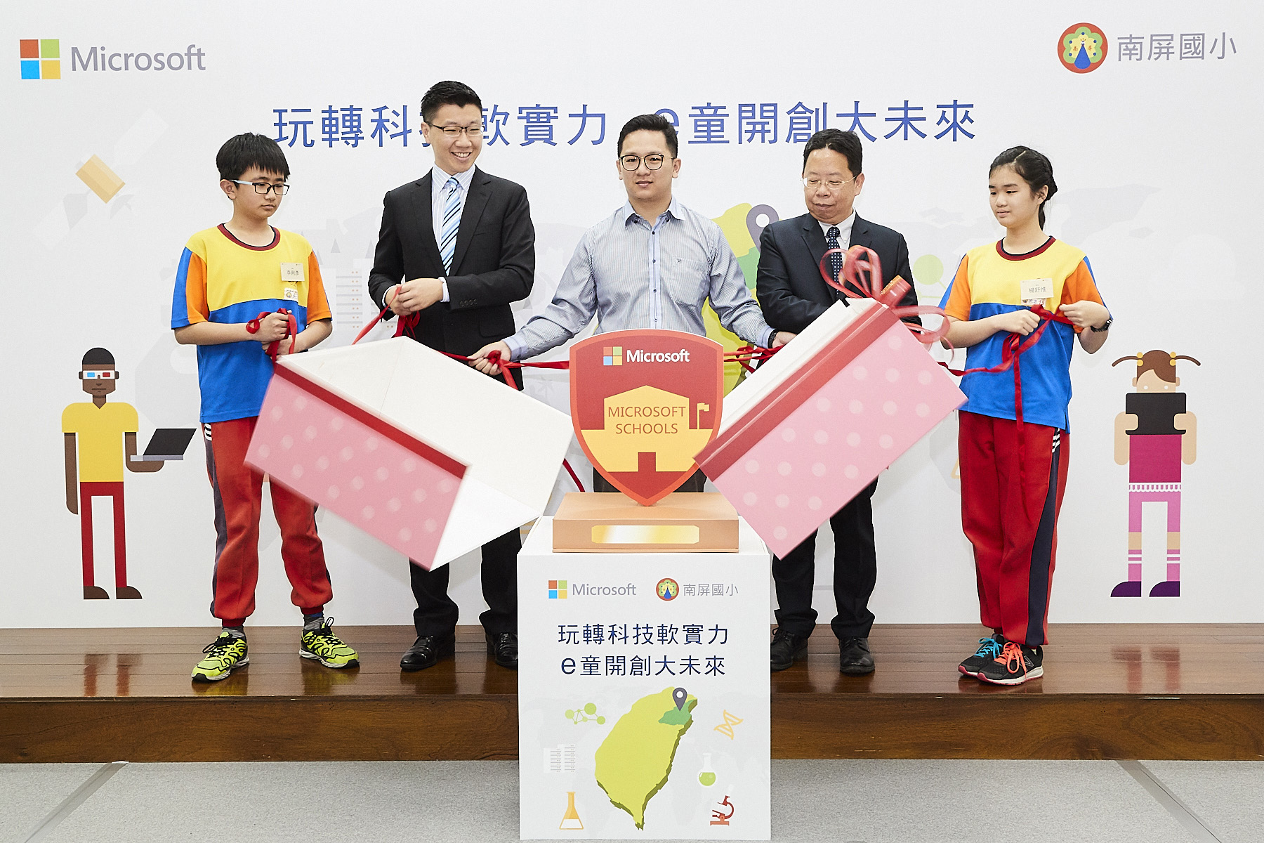 (2018年3月27日,宜蘭) 教育部108學年度十二年國民基本教育科技領域課程即將上路,將生活科技及資訊科技合設為「科技領域」,因此各學校無論在師資培育、軟硬體環境、課程設計巧思,皆積極設法轉型接軌。有鑑於此,宜蘭縣南屏國小致力科技翻轉教育,期望培養學童未來具備軟體應用核心能力,而微軟長期投入資訊科技與教育,幫助全球學校數位轉型經驗超過十年。此次,微軟及南屏國小秉持對未來人才培育的共同理念,於南屏國小67週年校慶及兒童節前夕攜手合作翻轉教育五大計畫,包括:優化行政效率並提升教學效能、自創3D世界培育運算思維、創客程式打造生活物聯網、虛實物件整合翻轉教學現場、設立教學資源中心整合師生學習環境,共同宣佈南屏國小成為宜蘭第一所微軟學校,讓學童透過遊戲式學習及微軟提供的教育平台及方案,培養學童STEAM(科學、科技、工程、藝術、數學)的軟實力,同時啟動第一個宜蘭區域教學示範中心,提供全台其他學校觀摩及學習。